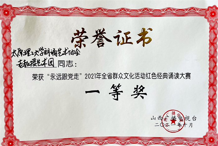 11月5日,由省委宣传部指导,省教育厅、文旅厅、体育局、广电局、总工会、团省委、省妇联、省文联联合主办的“永远跟党走”2021年全省群众文化活动红色经典诵读大赛决赛在山西广播电视台演播大厅举行。经过激烈角逐,我校选送、“老教授朗诵艺术团”朗诵、退休教师李蓉香、赵安源原创的作品《百年党引领 教育再辉煌——写在中国共产党成立100周年之际》荣获一等奖,为学校进一步引深党史学习教育、赓续红色血脉、弘扬红色文化、推进校园文化建设和艺术美育教育再添靓丽一笔。我校同时被大赛组委会授予“优秀组织奖”。